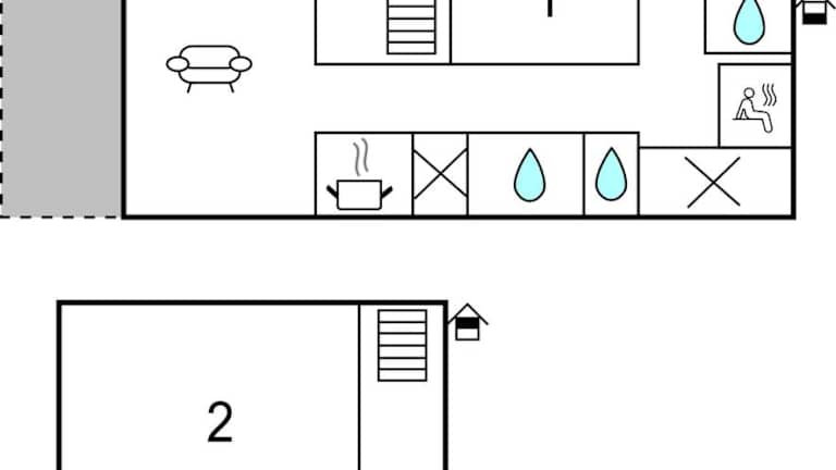 Das Ferienhaus verfügt über zwei Schlafzimmer, ein Wohnzimmer und eine voll ausgestattete Küche. Die Küche ist mit einem Kühlschrank und einer Kaffeemaschine ausgestattet. Zudem steht ein Badezimmer mit einer Dusche zur Verfügung.
