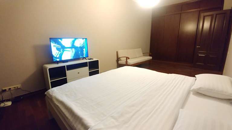 Die Ferienwohnung verfügt über ein Schlafzimmer, ein Wohnzimmer mit Satelliten-TV, eine voll ausgestattete Küche mit Kühlschrank und Ofen sowie ein Badezimmer mit Dusche. Handtücher und Bettwäsche werden gestellt. Die Ausstattung umfasst auch Heizung und Klimaanlage.