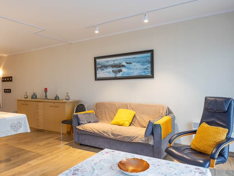 Die Ferienwohnung verfügt über zwei Schlafzimmer, ein Wohnzimmer mit TV, eine gut ausgestattete Küche mit Kühlschrank und Geschirrspüler sowie ein Badezimmer mit Dusche. Zusätzlich steht eine Terrasse mit Meerblick zur Verfügung.