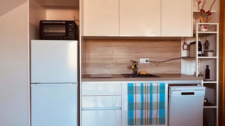Die Ferienwohnung besteht aus einem Schlafzimmer, einem Wohnzimmer, einer voll ausgestatteten Küche mit Kühlschrank und Kaffeemaschine sowie einem Badezimmer mit Dusche. Handtücher und Bettwäsche sind in der Unterkunft bereitgestellt.