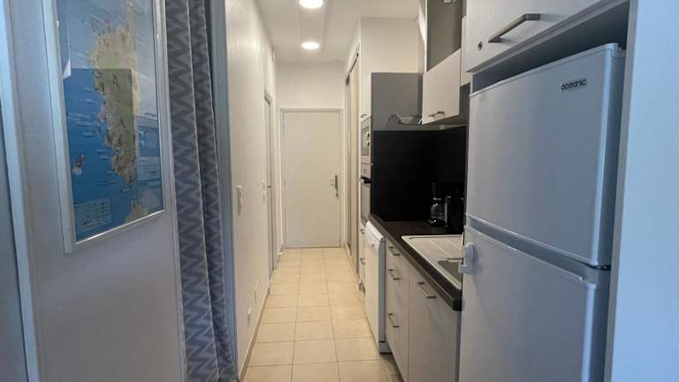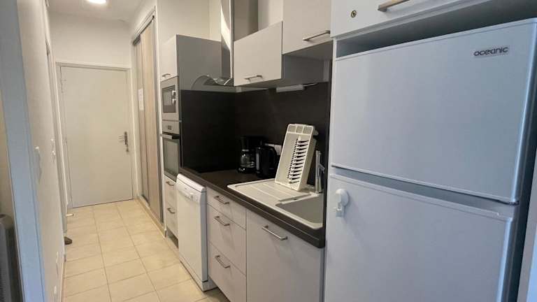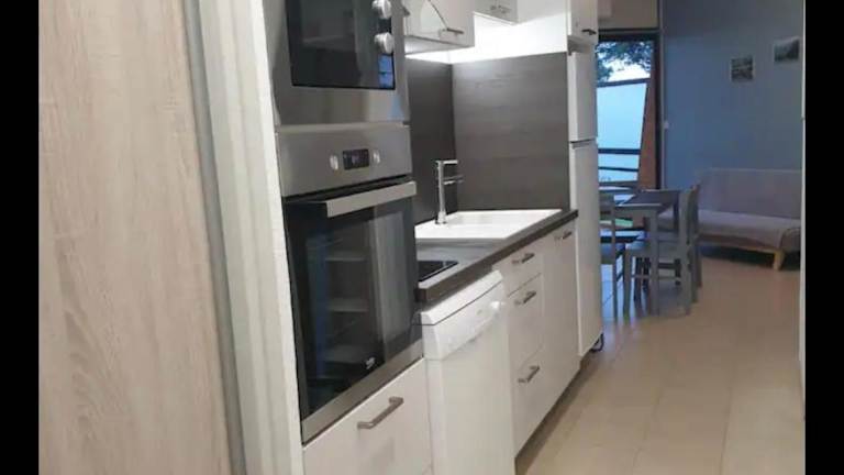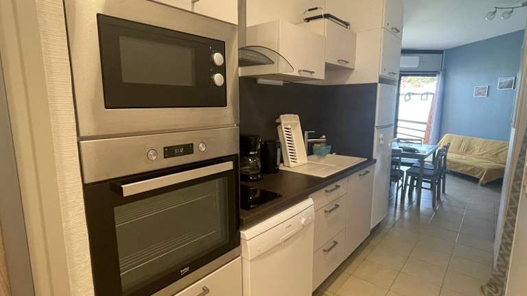 Die Ferienwohnung verfügt über einen Flachbild-TV sowie eine Küche, die mit einem Kühlschrank, einem Geschirrspüler, einem Ofen, einer Kaffeemaschine und einem Wasserkocher ausgestattet ist.
