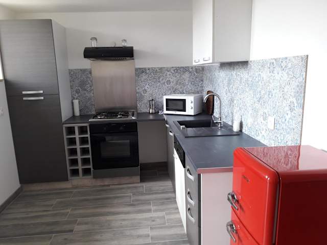 Die Ferienwohnung besteht aus einem Schlafzimmer und einer voll ausgestatteten Küche, die den Gästen die Möglichkeit bietet, eigene Mahlzeiten zuzubereiten. Der Zugang zur Terrasse ermöglicht es, die Umgebung im Freien zu genießen.