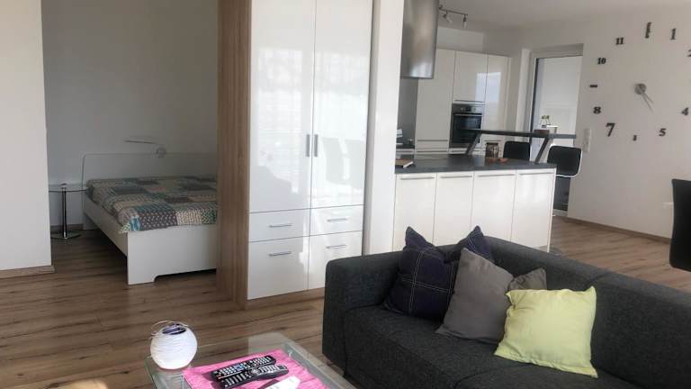 Die Ferienwohnung umfasst 1 Schlafzimmer, ein Wohnzimmer, einen Flachbild-TV und eine gut ausgestattete Küche mit Kühlschrank und Geschirrspüler. Das Badezimmer ist mit einer Dusche ausgestattet. Handtücher und Bettwäsche werden zur Verfügung gestellt.