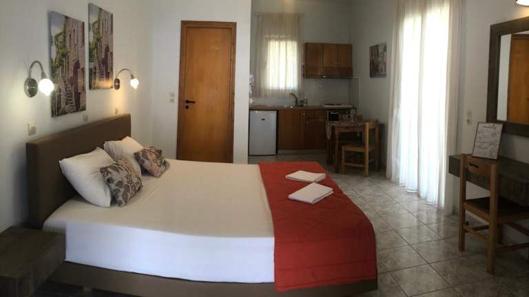 Die Studios und Apartments im Chrisanthi sind in hellen Farben gehalten und bieten eine gemütliche Atmosphäre. Die Unterkünfte verfügen über eine Küchenzeile mit einem Essbereich, so dass Sie Ihre Mahlzeiten bequem selbst zubereiten können. Die Zimmer sind klimatisiert und mit ergonomischen Matratzen ausgestattet, um Ihnen einen erholsamen Schlaf zu garantieren. Zur weiteren Ausstattung gehören ein Kühlschrank, ein elektrischer Backofen und ein Toaster. Im eigenen Bad finden Sie einen Haartrockner und kostenfreie Pflegeprodukte vor.