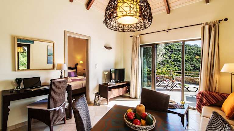 Die Cottages im Christos Place-Anidri bieten luxuriöse Unterkünfte zur Selbstverpflegung. Jedes Cottage verfügt über eine große Terrasse mit Liegestühlen, auf der Sie den atemberaubenden Panoramablick genießen können. Die Unterkünfte sind mit Holzbalkendecken, Holz- oder Fliesenböden, einer Fußbodenheizung und sorgfältig ausgewählten Möbeln ausgestattet. Jedes Cottage verfügt über einen gemütlichen Sitzbereich und eine gut ausgestattete Küchenzeile mit 2 Kochfeldern, Essecke, Kühlschrank und Mikrowelle. Zur weiteren Ausstattung gehören eine Klimaanlage und ein Flachbild-Sat-TV.