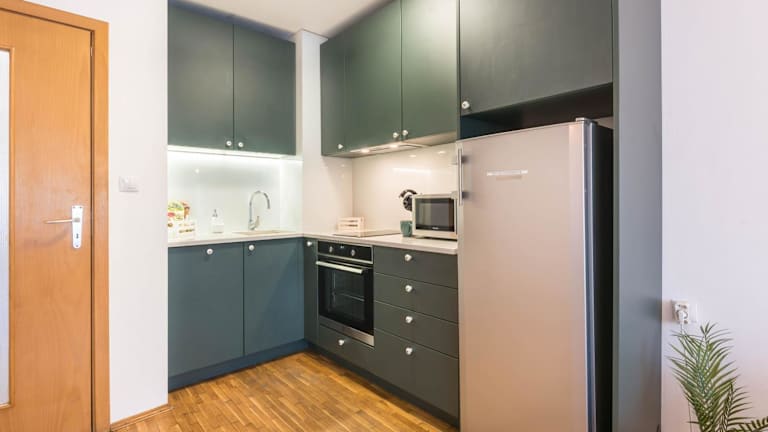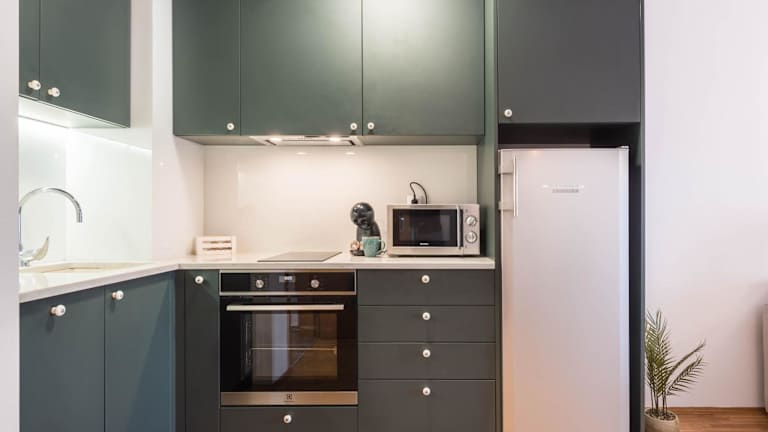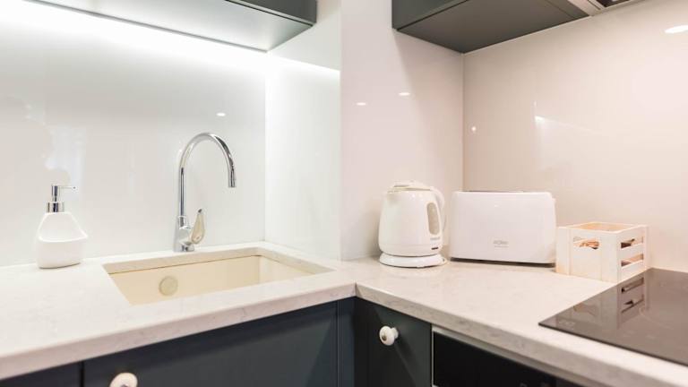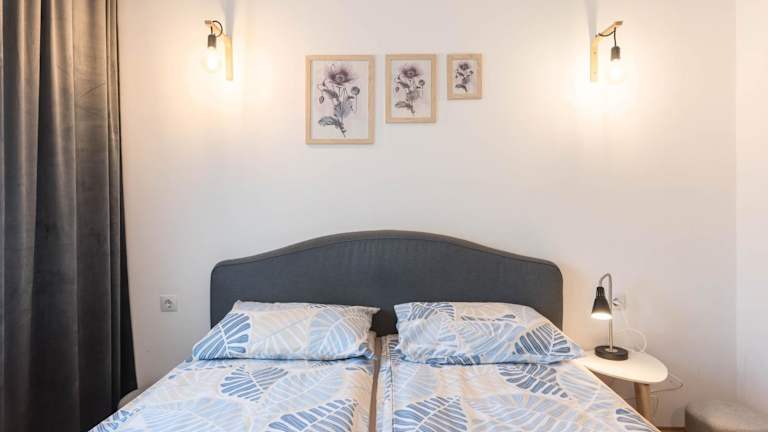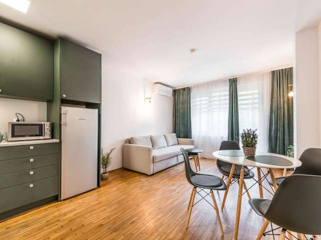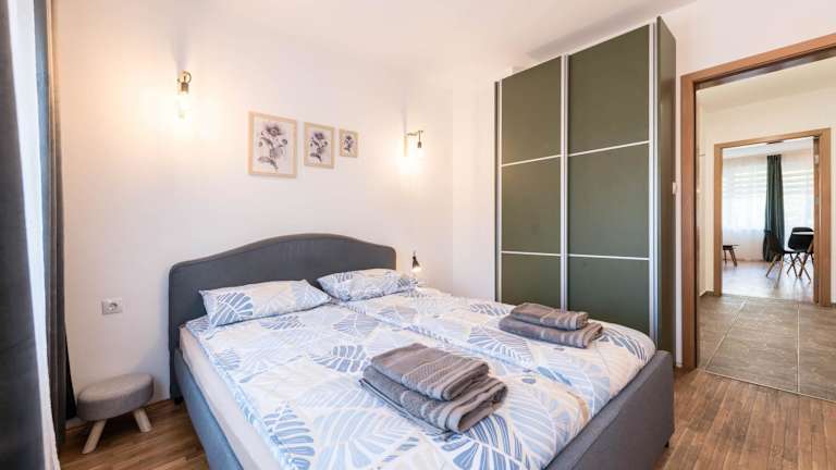 Die Ferienwohnung besteht aus einem Schlafzimmer und einem Wohnzimmer. Zur Ausstattung gehören eine voll ausgestattete Küche mit Kühlschrank und Kaffeemaschine sowie ein Badezimmer mit Dusche und Haartrockner. Handtücher und Bettwäsche werden bereitgestellt. Die Wohnung ist klimatisiert und bietet Stadtblick von der Terrasse.