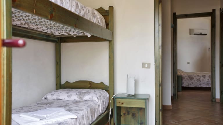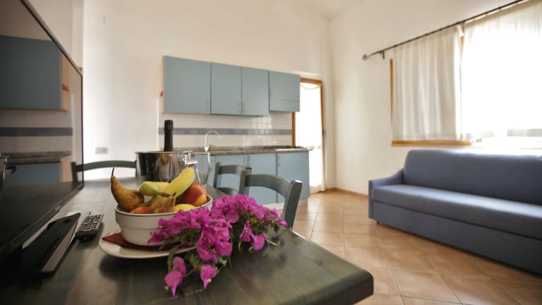 The residence has 55 apartments located in groups of two-storey villas with private entrance, equipped kitchenette, living room with air conditioning, fridge, bathroom with shower, TV. They also have a furnished patio or terrace. All the apartments have an air conditioning into the room or into the living room. They are divided into apartments with 4 beds (BILO 4), living room with sofa bed, kitchenette, and a double bedroom. Or apartments with 6/7 beds (1 in the living room with sofa bed) kitchenette, a double bedroom, a bedroom with bunk beds(TRILO A), or with the option of two bathrooms (TRILO B).