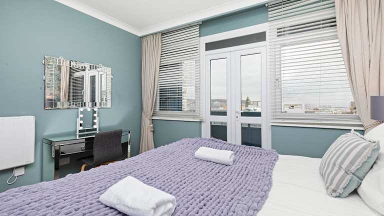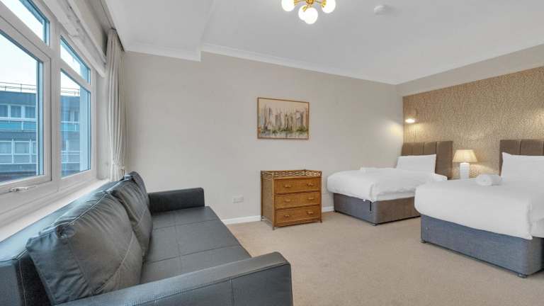 Die Ferienwohnung bietet Platz für bis zu drei Schlafzimmer, ein Wohnzimmer mit Flachbild-TV und eine gut ausgestattete Küche mit Kühlschrank und Ofen. Es gibt zwei Badezimmer, ausgestattet mit Duschen. Zur Ausstattung gehören außerdem Handtücher und Bettwäsche, die nach den Richtlinien der örtlichen Behörden gereinigt werden. Die Unterkunft verfügt zudem über einen Balkon mit Stadtblick.