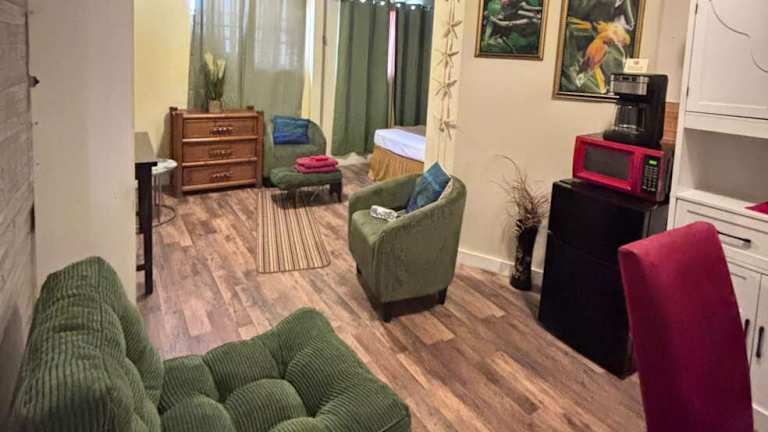 Das klimatisierte Apartment im Cocoplum Rest N Hideaway #1 verfügt über ein separates Schlafzimmer, in dem Sie sich nach einem erlebnisreichen Tag entspannen können. Das Badezimmer ist mit kostenlosen Pflegeprodukten ausgestattet. Es gibt auch einen gemütlichen Sitzbereich und ein Wohnzimmer, in dem Sie sich wie zu Hause fühlen können. Handtücher und Bettwäsche werden im Apartment gestellt, um Ihnen einen angenehmen Aufenthalt zu ermöglichen.