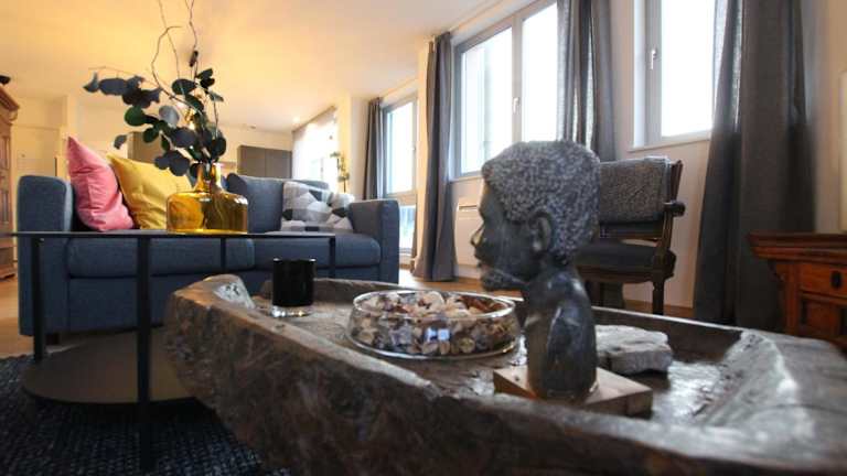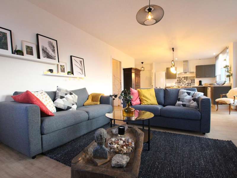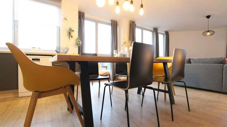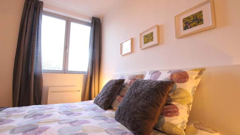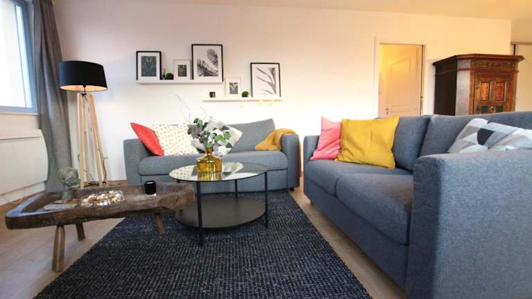 Die Ferienwohnung verfügt über zwei Schlafzimmer, ein Wohnzimmer und eine voll ausgestattete Küche mit Kühlschrank und Kaffeemaschine. Ein Badezimmer mit Dusche sowie Handtücher und Bettwäsche sind ebenfalls vorhanden.