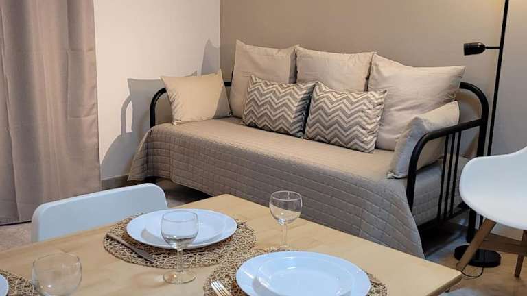 Die Ferienwohnung ist ausgestattet mit einer Küche, die einen Kühlschrank und eine Mikrowelle umfasst. Zu den weiteren Annehmlichkeiten gehören ein Flachbild-TV, ein Sitzbereich, ein Badezimmer mit Dusche sowie Handtücher und Bettwäsche.
