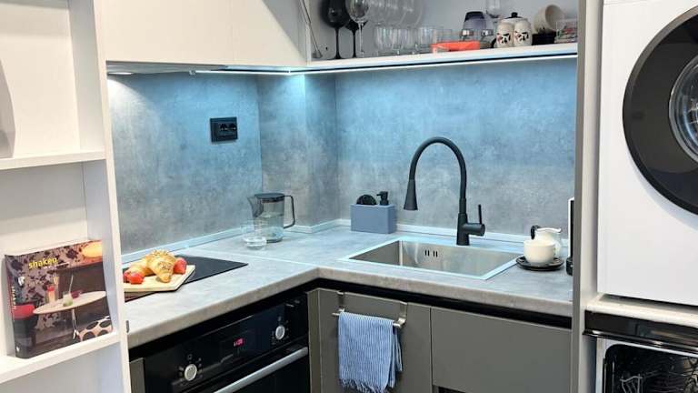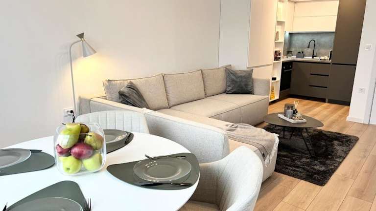Die Ferienwohnung verfügt über ein Schlafzimmer, ein Wohnzimmer, einen Flachbild-TV sowie eine gut ausgestattete Küche mit Kühlschrank und Geschirrspüler. Im Badezimmer steht eine Dusche zur Verfügung.