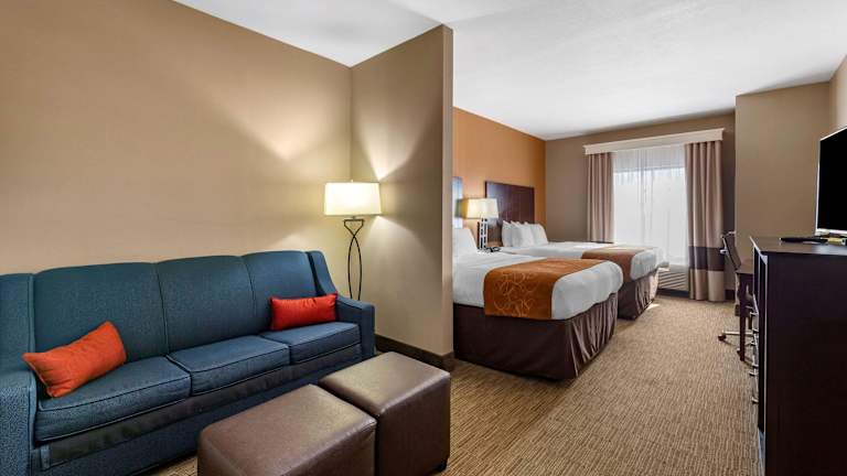 Das Comfort Suites Hotel bietet 53 Nichtraucherzimmer, die über einen Aufzug erreichbar sind. Die Zimmer sind stilvoll gestaltet und verfügen über eine Klimaanlage, ein bequemes Doppelbett, einen Schreibtisch und eine Ausstattung mit einem Kühlschrank, einer Mikrowelle und einer Tee-/Kaffeemaschine. Zur weiteren Ausstattung gehören ein Telefon, ein Sat-TV und kostenfreies WLAN. Die Badezimmer sind mit einer Dusche, einem Haartrockner und kostenlosen Kosmetikartikeln ausgestattet. Rollstuhlgerechte Zimmer mit barrierefreiem Badezimmer sind ebenfalls verfügbar.