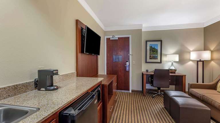 Die 72 Nichtraucherzimmer des Comfort Suites Visalia Convention Center erstrecken sich über vier Etagen und sind bequem über einen Aufzug erreichbar. Das Hotel bietet WLAN ohne Gebühr und rollstuhlgerechte Einrichtungen. Zu den weiteren Annehmlichkeiten gehören ein Fitnesscenter, kostenloser Kaffee und eine kostenlose Zeitung. Es gibt auch eine Wäscherei vor Ort. Für Geschäftsreisende stehen ein Kopier- und Faxservice sowie ein Konferenzraum zur Verfügung. Die Zimmer sind geräumig und verfügen über Annehmlichkeiten wie einen Kühlschrank, eine Mikrowelle, eine Kaffeemaschine, ein Bügeleisen/-brett und kostenloses HBO. Es gibt auch Zimmer mit Kingsize-Bett und Whirlpool-Badewanne.