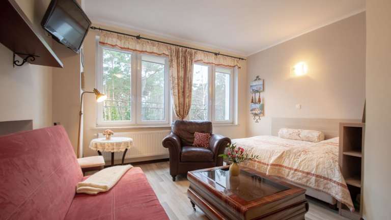 Das Comfort Willa in Jurata ist eine charmante Unterkunft in einem renovierten Gebäude aus dem Jahr 1937. Mit seiner ruhigen Lage in einer Straße und seiner Nähe zum Pier und zum Strand an der Ostsee bietet es eine ideale Ausgangsbasis für einen entspannten Aufenthalt. Die Zimmer sind gemütlich eingerichtet und verfügen über moderne Annehmlichkeiten wie Flachbild-TV und eigenes Bad. Die Küchenzeile auf jeder Etage ermöglicht es den Gästen, sich selbst zu versorgen. Die Unterkunft bietet auch überwachte Parkplätze und liegt in der Nähe von Wander- und Radwegen. In der Umgebung gibt es eine Vielzahl von Restaurants und Cafés, in denen man kulinarische Köstlichkeiten genießen kann. Wassersportmöglichkeiten wie Windsurfen und Kitesurfen sind ebenfalls in der Nähe vorhanden.