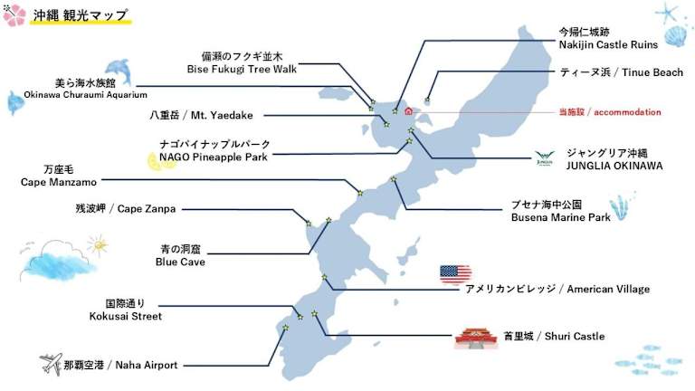 Die Unterkunft befindet sich in Nakijin, nur 1,8 km vom Koechi Beach entfernt. Sehenswürdigkeiten wie die Nakijin Gusuku Festung liegen 7,3 km entfernt und es gibt eine Anbindung an verschiedene interessante Orte, darunter der Onna-son Community Center in 34 km Entfernung. Der Flughafen Naha ist 79 km von der Ferienwohnung entfernt.