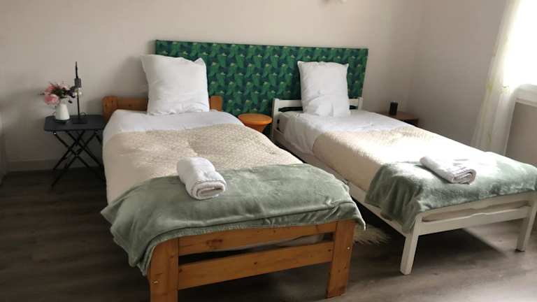 Die Wohnung verfügt über zwei Schlafzimmer, ein Wohnzimmer und eine voll ausgestattete Küche mit Kühlschrank und Kaffeemaschine. Ein Badezimmer mit Dusche und Haartrockner ist ebenfalls vorhanden. Handtücher und Bettwäsche werden zur Verfügung gestellt.