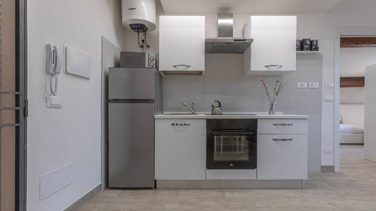 Die Ferienwohnung verfügt über eine voll ausgestattete Küche mit Kühlschrank und Wasserkocher.