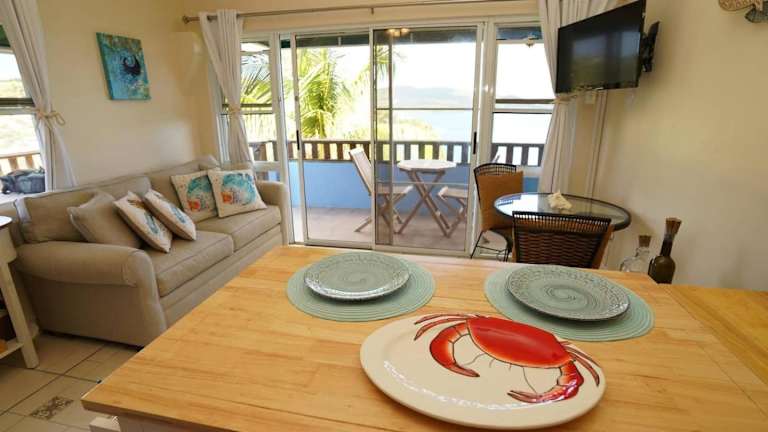 Das klimatisierte Apartment im Coqui Beach Home verfügt über 1 Schlafzimmer und 2 Badezimmer. Es bietet Platz für bis zu 2 Personen und ist mit Bettwäsche und Handtüchern ausgestattet. Das Apartment verfügt über einen Flachbild-TV, einen Essbereich und eine voll ausgestattete Küche, in der Sie Ihre eigenen Mahlzeiten zubereiten können. Auf der Terrasse können Sie den Meerblick genießen.