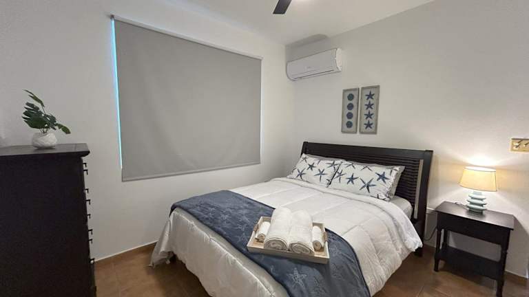 Die Ferienwohnung verfügt über ein Schlafzimmer, ein Wohnzimmer und eine voll ausgestattete Küche, die mit einer Mikrowelle ausgestattet ist. Zudem gibt es ein Badezimmer mit Dusche und Haartrockner. Zur Ausstattung gehören Klimaanlage, Handtücher und Bettwäsche.