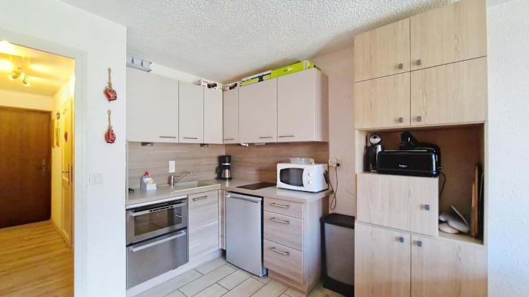 Die Ferienwohnung ist mit einer voll ausgestatteten Küche ausgestattet, die über einen Geschirrspüler, Ofen, Mikrowelle, Kaffeemaschine und Wasserkocher verfügt.