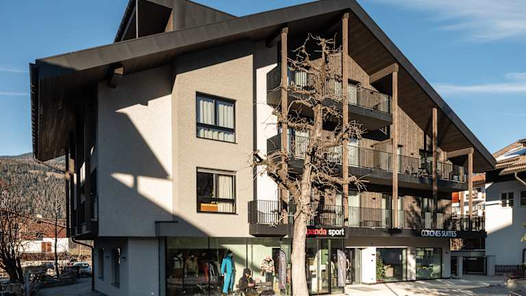 Die Corones Suites Dolomites Residence liegt im Zentrum von Mitterolang am Florianiplatz 6, mitten im Pustertal mit herrlichem Blick auf die Dolomiten. Geschäfte, Restaurants und Cafés befinden sich direkt vor der Tür. Die Talstation des Kronplatz erreichen Sie in wenigen Minuten mit dem Skibus oder Auto. Von der Autobahnausfahrt Brixen/Pustertal sind es rund 40 km bis zu uns.