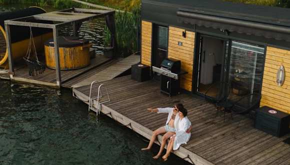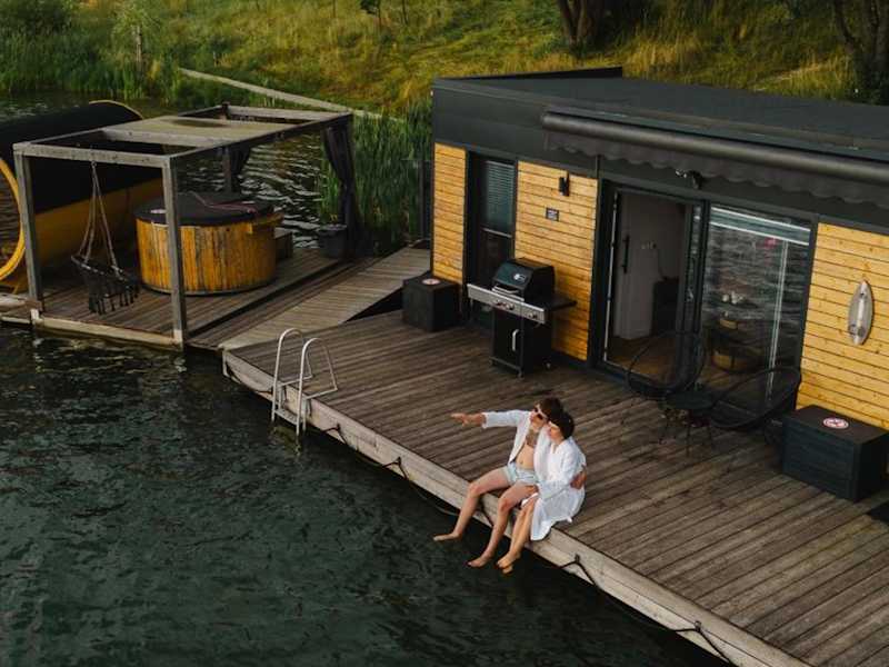Costa del Kryspi Całoroczne Domy na Wodzie bietet Übernachtungsmöglichkeiten in Form von Ferienhäusern auf dem Wasser. Die Unterkunft stellt Klimaanlage und kostenloses WLAN zur Verfügung und bietet eine Terrasse mit Seeblick.