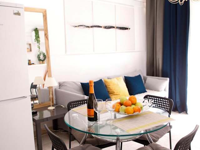Die Ferienwohnung verfügt über ein Schlafzimmer, ein Wohnzimmer mit einem Flachbild-TV mit Satellitenkanälen, eine vollständig eingerichtete Küche mit Kühlschrank und Geschirrspüler sowie ein Badezimmer mit Dusche. Handtücher und Bettwäsche werden bereitgestellt.