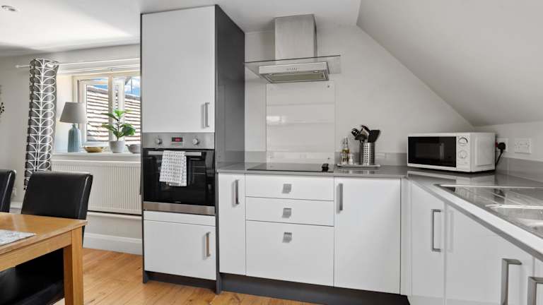 Die Unterkunft umfasst eine voll ausgestattete Küche mit Kühlschrank und Geschirrspüler, die den Gästen die Möglichkeit bietet, eigene Mahlzeiten zuzubereiten.
