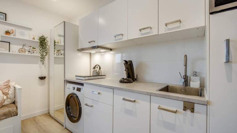 Die Ferienwohnung verfügt über eine voll ausgestattete Küche mit Kühlschrank, Geschirrspüler, Ofen, Kaffeemaschine und Wasserkocher, was eine Selbstverpflegung ermöglicht.