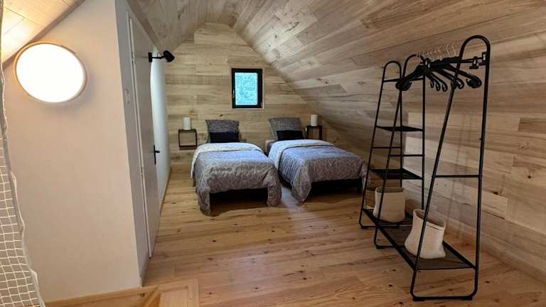Das Chalet verfügt über zwei Schlafzimmer, ein Wohnzimmer, eine voll ausgestattete Küche mit Kühlschrank und Kaffeemaschine sowie ein Badezimmer mit Dusche und Whirlpool. Handtücher und Bettwäsche werden bereitgestellt. Die Klimaanlage sorgt für einen angenehmen Aufenthalt. Wünsche zur Ankunftszeit werden erbeten, um eine reibungslose Ankunft zu gewährleisten.