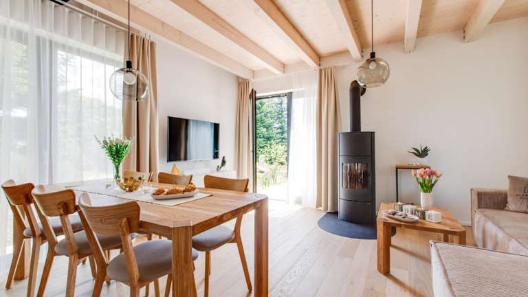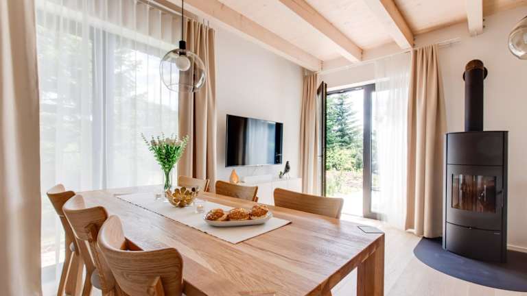 Das Chalet bietet Platz in drei Schlafzimmern sowie einem Wohnzimmer mit Flachbild-TV. Die gut ausgestattete Küche umfasst einen Kühlschrank und einen Geschirrspüler. Es sind zwei Badezimmer mit Dusche vorhanden. Handtücher und Bettwäsche werden bereitgestellt.