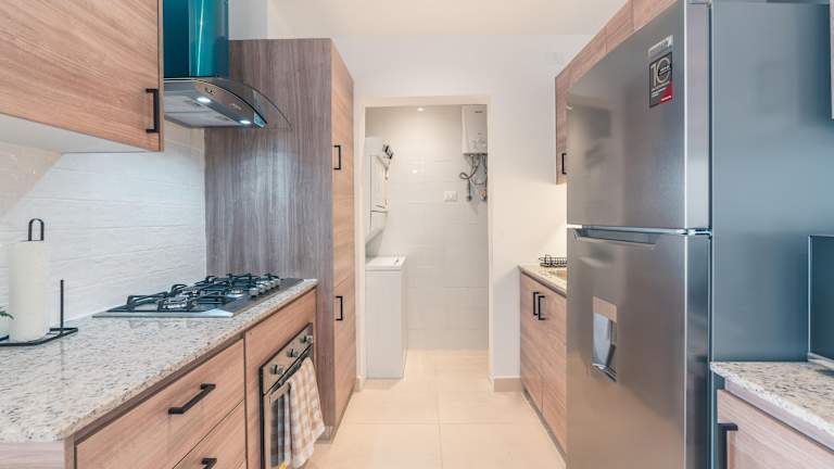 Das Apartment umfasst 1 Schlafzimmer, ein Wohnzimmer sowie eine voll ausgestattete Küche, die mit einem Kühlschrank und einer Kaffeemaschine eingerichtet ist. Es gibt ein Badezimmer mit Dusche und Haartrockner. Handtücher und Bettwäsche werden bereitgestellt.