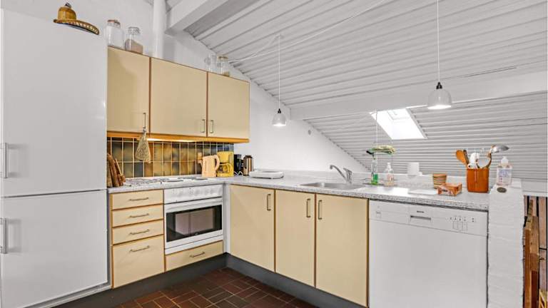 Die Ferienwohnung verfügt über eine Küche, die mit einem Kühlschrank, einem Geschirrspüler sowie einer Kaffeemaschine ausgestattet ist.