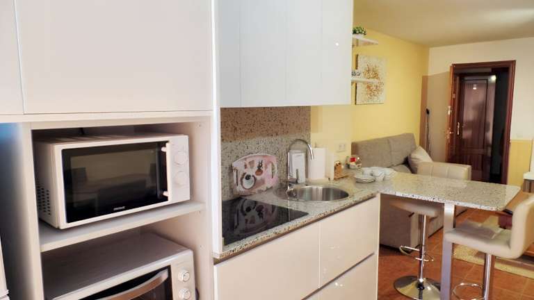 In der Ferienwohnung ist eine voll ausgestattete Küche vorhanden, die einen Kühlschrank und einen Ofen umfasst. Es werden Handtücher und Bettwäsche bereitgestellt.