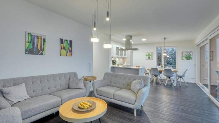 Die Unterkunft verfügt über zwei Schlafzimmer sowie ein Wohnzimmer. Die gesamte Ferienwohnung ist geschmackvoll eingerichtet und bietet komfortable Aufenthaltsmöglichkeiten für die Gäste.