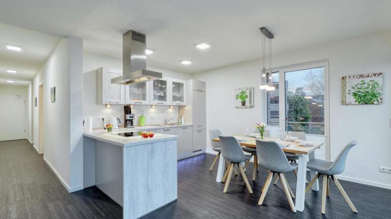 Die Ferienwohnung ist mit einer voll ausgestatteten Küche ausgestattet, die unter anderem einen Kühlschrank und einen Geschirrspüler beinhaltet, was die Selbstverpflegung ermöglicht. Weitere Verpflegungsangebote sind nicht aufgeführt.