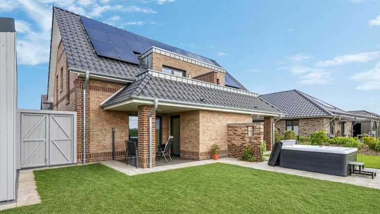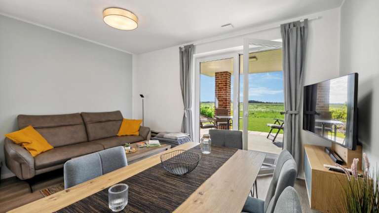 Die Ferienwohnung umfasst ein Badezimmer mit Dusche und Whirlpool. Die Küche ist mit einem Kühlschrank und einer Kaffeemaschine ausgestattet. Zudem stehen Gartenmöbel bereit.