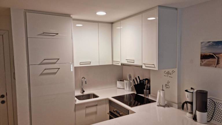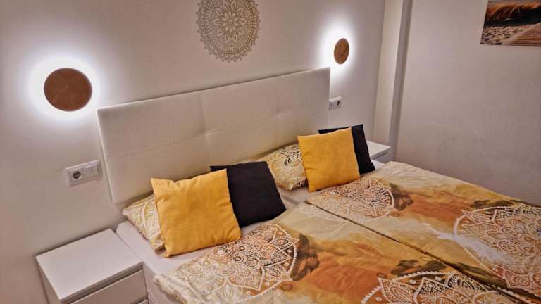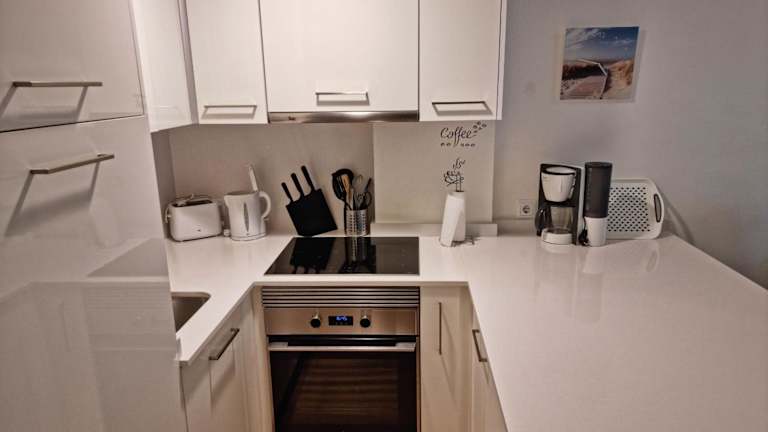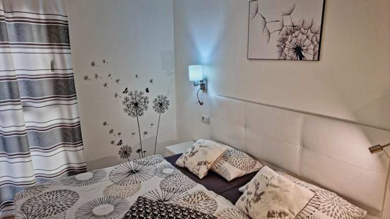 Die Ferienwohnung verfügt über zwei Schlafzimmer, eine voll ausgestattete Küche mit Kühlschrank und Geschirrspüler, einen Flachbild-TV sowie einen Sitzbereich. Ein Badezimmer mit Dusche ist ebenfalls vorhanden. Handtücher und Bettwäsche werden bereitgestellt. Die Wohnung bietet zudem Meerblick und einen Balkon.