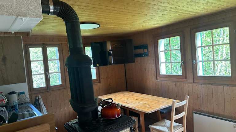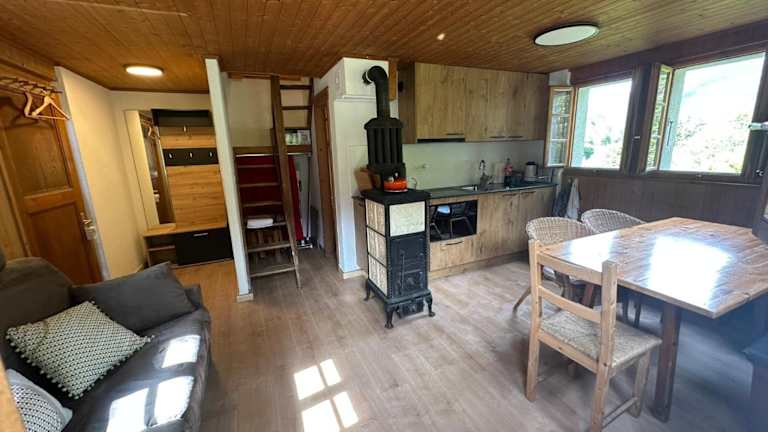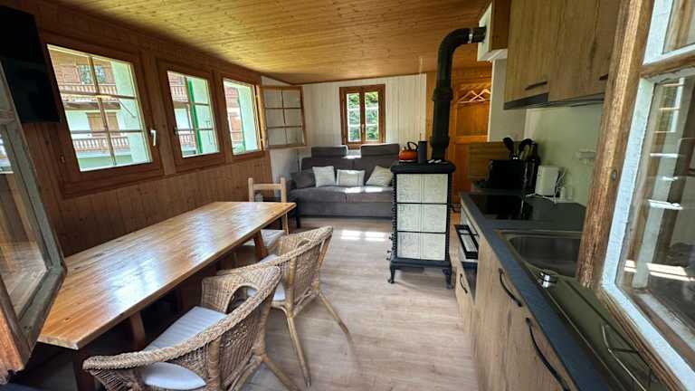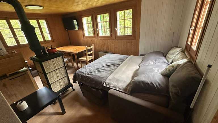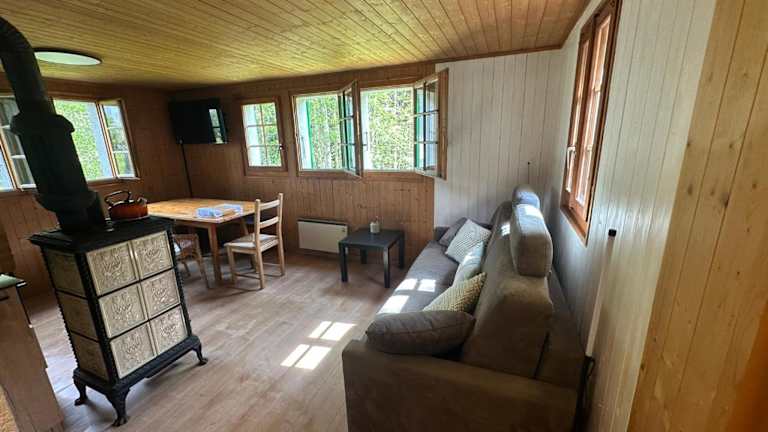 Das Chalet verfügt über ein Schlafzimmer, ein Wohnzimmer, einen Flachbild-TV, eine gut ausgestattete Küche mit Kühlschrank und Ofen sowie ein Badezimmer mit Badewanne oder Dusche. Zudem sind Handtücher und Bettwäsche vorhanden. Zum Chalet gehört auch ein Balkon sowie eine Terrasse mit Stadtblick.