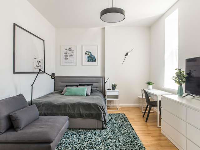 Das Cozy Modern Studio befindet sich in bester Lage im Stadtzentrum von Riga. Sie werden nur 300 m vom Vermanes-Garten entfernt sein, einem beliebten Park, der zum Entspannen und Spazierengehen einlädt. Auch die Geburt Christi in Riga ist nur 700 m entfernt und bietet Ihnen die Möglichkeit, die beeindruckende Architektur der Stadt zu bewundern. Der Rathausplatz von Riga und das Schwarzhäupterhaus liegen nur 1,3 km vom Apartment entfernt. In der Umgebung finden Sie auch das Lettische Nationalmuseum für Kunst, die Lettische Nationaloper und den Bastejkalna Park. Der internationale Flughafen Riga ist nur 11 km entfernt und gut erreichbar.