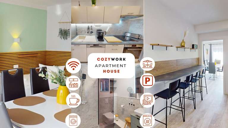 CozyWork Apartment House bietet Übernachtungsmöglichkeiten mit kostenlosem WLAN und kostenlosem Privatparkplatz. Die Unterkunft verfügt über mehrere Wohneinheiten mit einer Vielzahl an Annehmlichkeiten.
