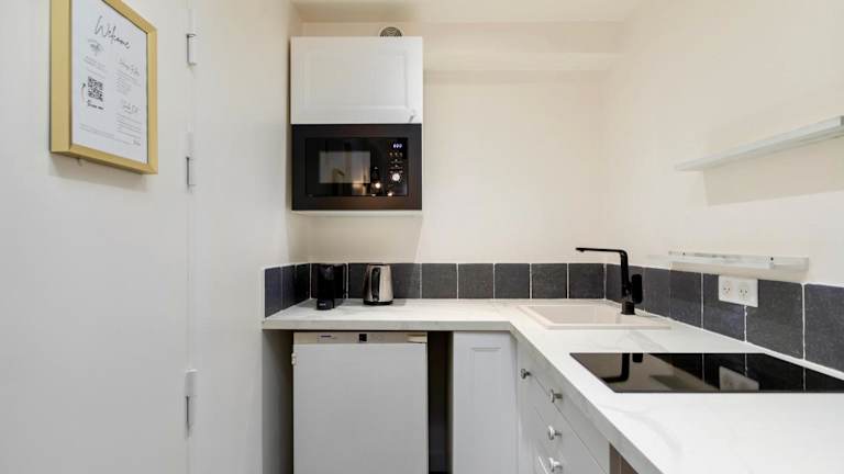Die Unterkunft verfügt über eine voll ausgestattete Küchenzeile mit einem Kühlschrank und einer Mikrowelle, die den Gästen die Zubereitung eigener Mahlzeiten ermöglicht.