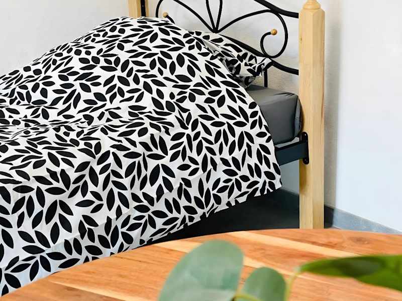 Die Ferienwohnung umfasst ein Schlafzimmer, eine Küche, die mit einem Kühlschrank und einem Ofen ausgestattet ist, sowie ein Badezimmer mit Dusche und kostenlosen Pflegeprodukten. Handtücher und Bettwäsche werden bereitgestellt, und eine Waschmaschine ist ebenfalls vorhanden.