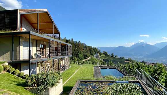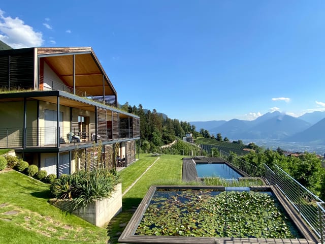 Klare Linien, modernes Design und die Alpenkulisse immer fest im Blick: Das DAHOAM mit Panoramablick auf die Kurstadt Meran in Südtirol ist der perfekte Urlaubsort für Ruhesuchende: Naturnähe, Stil und Komfort unter einem (begrünten) Dach – und zusätzlich großer Wert auf eine nachhaltige Architektur, Bau- und Lebensweise. Das DAHOAM besteht aus zwei Häusern. Die fünf Suiten und zwei Privatchalets des DAHOAM sind exklusive Hideaways mit ansprechender Architektur, geprägt durch unbehandeltes Lärchenholz, errichtet in klimafreundlicher Passivbauweise. An kalten Abenden sorgt knisterndes Feuer im Holzofen in den beiden Privatchalets für kuschelige Stunden. Die Einrichtung ist minimalistisch und hochwertig. Privatsphäre wird hier ganz großgeschrieben. Private kleine Gärte, eine finnische Holzaußensauna, der extra angelegte Naturpool sowie ein Hot Tub Whirlpool im Refugium und die privaten Saunen im Garden- und Panoramachalet sorgen für pure Entspannung. Gleichzeitig schenken bodentiefe, nach Süden weisende Panoramafenster einen fantastischen Blick auf das grandiose Alpenpanorama. 11 GRÜNDE, WARUM DAS DAHOAM IHRE URLAUBSDESTINATION IST: 1. die klare Architektur gliedert sich nahtlos in die Naturkulisse ein. 2. selbst entworfene Möbel der Hausherrin, gemischt mit ein paar Designklassikern, ergeben ein schönes Miteinander und passen zum klaren und reduzierten Interiorkonzept. 3. Lage, Lage, Lage: Der unglaublich tolle Blick, den die Häuser in Hanglage auf die Alpenkulisse bietet. 4. ein großer Garten mit einem Naturpool und Seerosenteich umschließt das Refugium. 5. die verschiebbaren Lärchen-Sonnenschutzelemente sind ein tolles Designelement zur Verschattung. 6. im Winter wird mit einer Niedrigenergie-Fußbodenheizung geheizt, im Sommer wird damit gekühlt. 7. Jede Einheit ist mit einer kontrollierten Be- und Entlüftung ausgestattet. 8. Die Größe des Hauses: nur fünf Suiten und zwei private Chalets bieten viel Privatsphäre. 9. Ruhe, Frieden und Erholung sind im Fokus: Das DAHOAM ist für Erwachsene und Jugendliche ab 14 Jahren 10. die Möglichkeit, frische Croissants und Brötchen vor die Tür geliefert zu bekommen. 11. tolle Weingegend für Weinfreunde GUT ZU WISSEN: Die beiden Häuser liegen ungefähr 800 Meter voneinander entfernt und befinden sich auf 800 Meter Höhe. Den beiden Häusern liegt nicht nur ein hoher ästhetischer Anspruch zugrunde, sie wurden auch sehr umweltbewusst gebaut: Erstklassige Wärmedämmung, Dreifachverglasung, Nutzung von Regenwasser und Sonnenenergie, Luft-Wärmepumpe, und sogar kontrollierte Be- und Entlüftung mit CO2-Sensor bzw. Wärmerückgewinnung