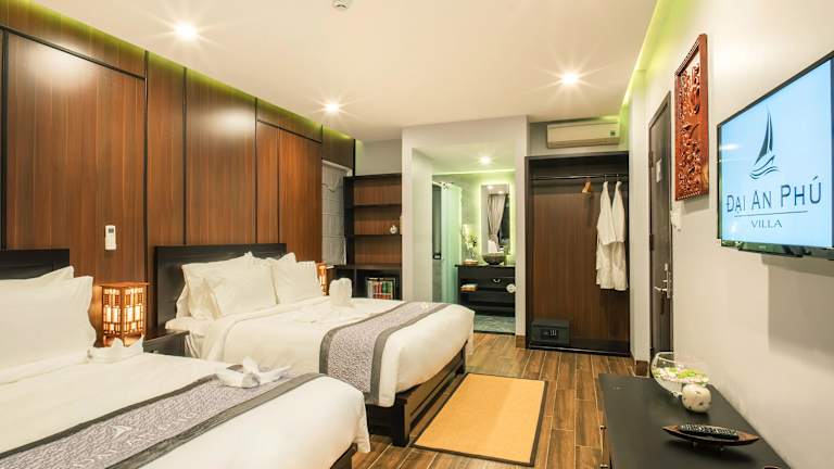 Die Zimmer im Dai An Phu Villa sind modern und lichtdurchflutet. Jedes Zimmer ist klimatisiert und verfügt über einen Flachbild-Kabel-TV sowie eine Minibar. Das private Badezimmer ist mit einer Regendusche und kostenlosen Pflegeprodukten ausgestattet. Einige Zimmer bieten zudem einen schönen Blick auf den Pool oder den Garten. Für zusätzlichen Komfort stehen Bademäntel und Hausschuhe zur Verfügung.