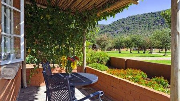Die großzügig angelegte Lodge liegt eingebettet in abwechslungsreiche Gartenanlagen. Das Hauptgebäude, dessen Wände mit Motiven der Felsgravuren von Twyfelfontein geschmückt sind, wurde unter Mopane-Bäumen errichtet. Jedes der 55 Doppelzimmer-Chalets (mit Klimaanlage) liegt inmitten eines Gemüse- und Kräutergartens, der von einer niedrigen Mauer umgeben ist. Die Gärten liefern frische Zutaten fürs Abendbrot, das aus warmer Vorspeise und leckerer Vesper-Platte besteht. Ein Schwimmbecken dient zur Abkühlung, ein Aussichtspunkt zum Genießen von Sonnenuntergängen und Sternenhimmel. Die Lodge an der Pforte zum Damaraland eignet sich ideal für Ausflüge nach Twyfelfontein (130 km), zum Versteinerten Wald (70 km) und zur Vingerklip-Felssäule (50 km).