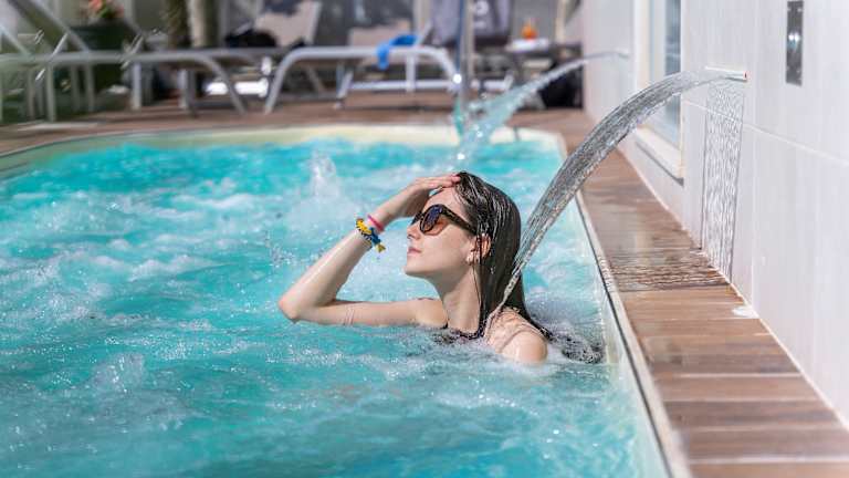 Im Außenbereich gibt es einen Solarium zone mit Liegestühlen, einen beheizten Whirlpool und einen warmen Pool mit Zervikalwasserfällen.