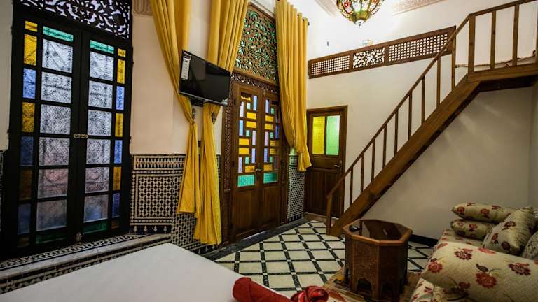 Das Dar Layali Fez bietet klimatisierte Zimmer mit einer stilvollen Einrichtung und modernen Annehmlichkeiten. Jedes Zimmer verfügt über einen Schreibtisch, einen Safe, einen Flachbild-TV und ein eigenes Badezimmer mit Dusche. Einige Zimmer haben auch eine Terrasse, auf der Sie entspannen können. Bettwäsche und Handtücher sind in den Zimmern vorhanden.