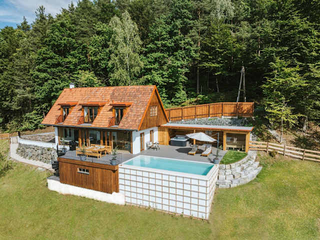 Die Unterkunft befindet sich in Sankt Johann im Saggautal, umgeben von einer malerischen Landschaft mit Blick auf die Berge und den Pool.